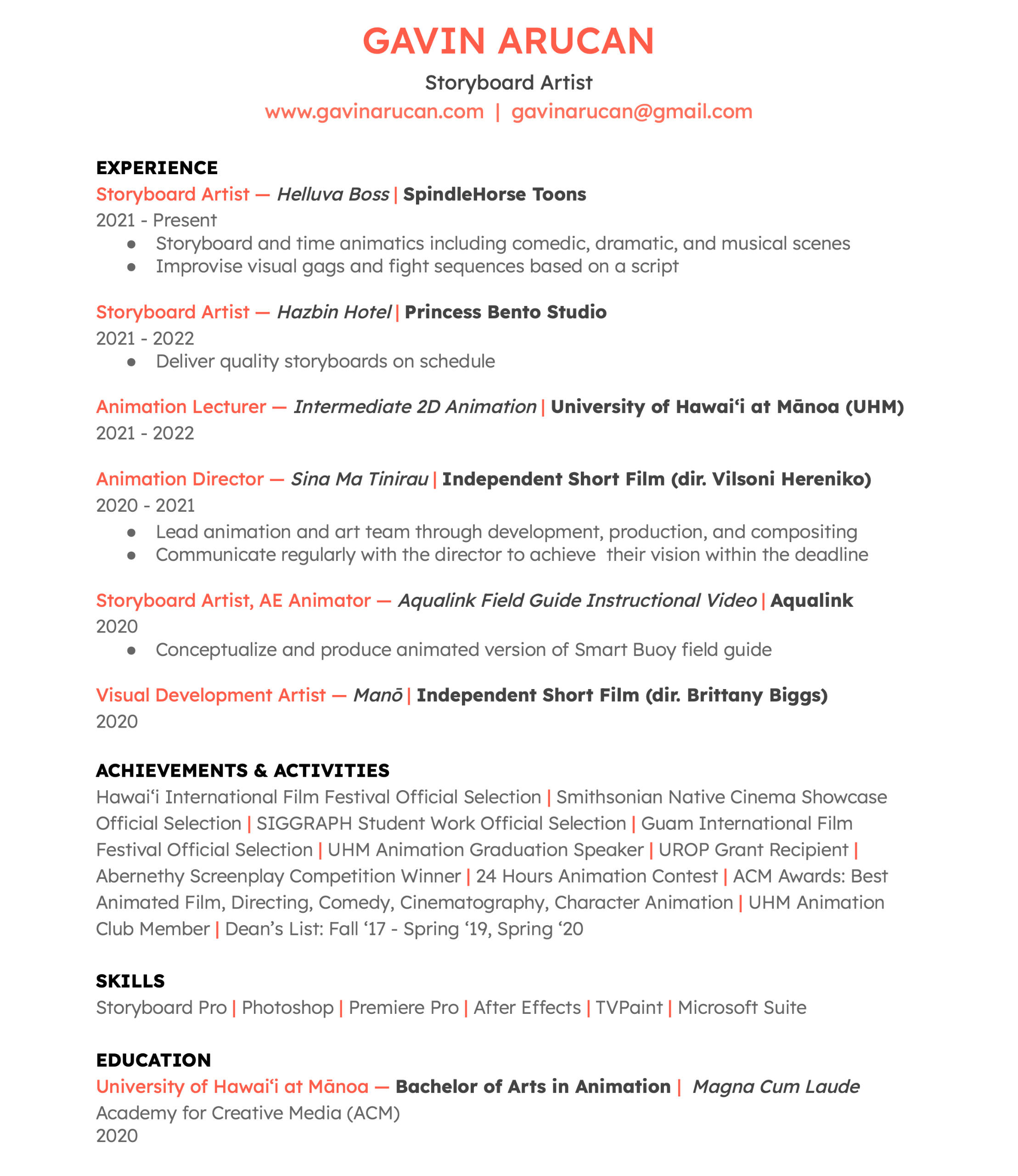 Aloha, my name is Gavin Arucan! I’m a Filipino and Japanese-American storyboard artist from Hawaiʻi, currently working on the animated webseries Helluva Boss! I've also storyboarded for the Hazbin Hotel series.I graduated from the University of Hawaiʻi at Mānoa in 2020 with a B.A. in Animation, with a passion to tell stories rooted in the culture of my home in rural Oʻahu and Kauaʻi.In my free time I love watching movies, playing Pokémon, hiking and reading queer BIPOC graphic novels! I create a slice-of-life comic on Webtoon Canvas called The Pākalā Kids!Studios: Princess Bento, SpindleHorseI'm available for fulltime and freelance Storyboard and Revisionist work!